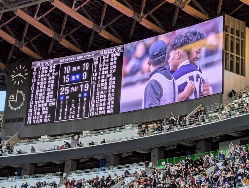 後半開始早々、明治は早稲田のキックをチャージ、弾いたボールを拾いそのまま走り込みトライし、「15対10」と逆転に成功! その後は両校がペナルティーゴールを決め合い「18対16」と早稲田が2点差まで迫りましが、後半残り10分で明治がまたしてもモールで相手ゴール直前までなだれ込み、最後は力で押し込み追加のトライを奪い「25対16」と突き放しました。