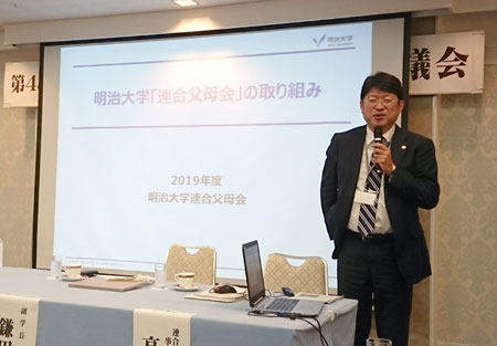 続いて連合父母会の須藤政弘会長より父母会の目的、事業、予算などについてのご説明とスポーツ応援を軸とした活動の方針についてのお話、明治大学父母会連携事務室の高瀬功事務長から今年度の連合父母会の主なスケジュール等のご報告がありました。