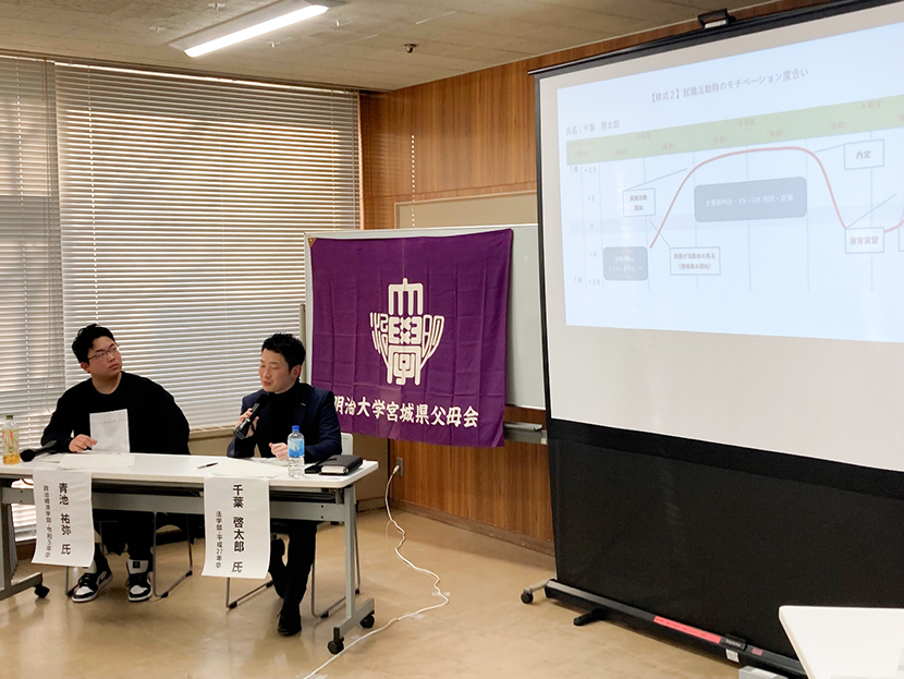 第二部は卒業生による就職体験談とういうことで、卒業生2人と佐藤会長の対談形式で行われました。千葉さん(平成27年卒)、青池さん(令和5年卒)よりいつの時期から就職活動始めたのか。インターンシップはどうだったか。何社受け内定になった企業は何社か等々リアルな体験談が聞けました。
