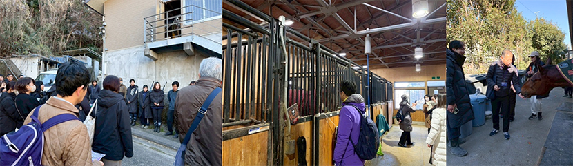 最初に訪問したのは馬術部の厩舎です。部員の皆様は朝一番で馬の世話をした後に私たちを待っていてくれました。さらにテスト前の大切な時間も割いてくれたようです。馬と一緒に写真を撮ったり、馬にニンジンをあげたりして初めての体験でした。今年のお正月に有名になった馬にも会うことができました。部員の方々から、馬術の魅力も語っていただき、本当に有意義な時間を過ごすことができました。部員の皆様、ありがとうございました。
