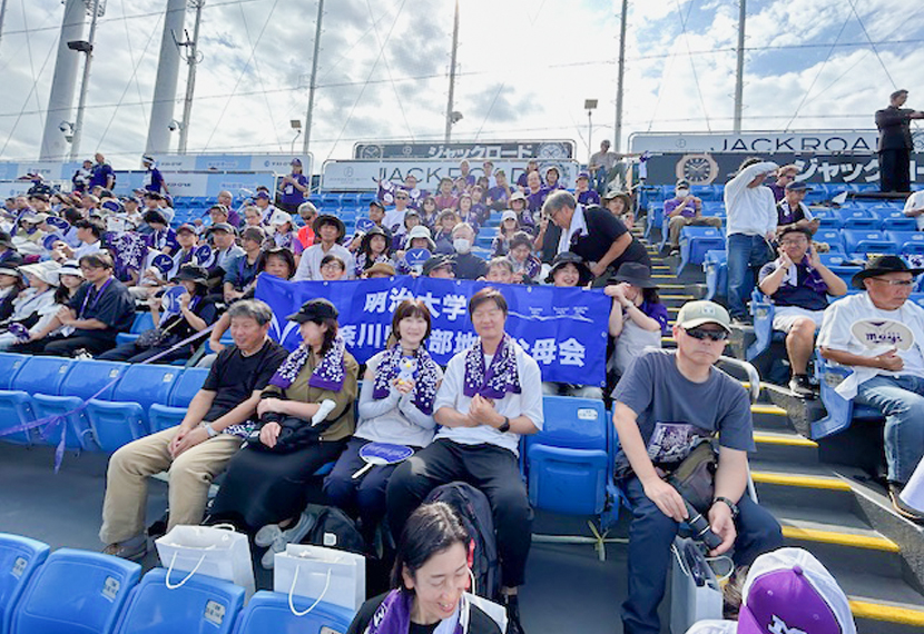 参加いただきました父母会会員の皆様には、チケット・パンフレット・うちわ・紫紺に「奪還」の文字を掲げた応援タオル・折り畳み座布団をプレゼント。