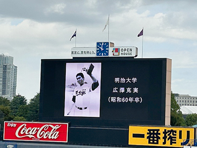 始球式は明治大学OBの広沢克己さん(元 ヤクルト~巨人~阪神)が担当され、見事な速球で球場は温かい拍手に包まれ明治大学の誇りを感じる瞬間でした。