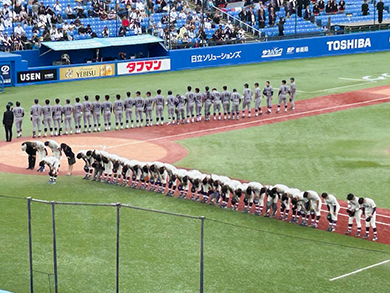 試合前のエール交換の準備の掛け声が響き、脱帽して慶応大学応援団に敬意を表します。最初から六大学野球の伝統と格式に圧倒されました。