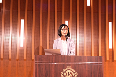 冒頭、神奈川東部地区の小嶋会長のご挨拶の後、来賓としてご出席された明治大学 副学長 農学部教授 浜本牧子先生から、浜本先生の研究テーマ、農学部の研究内容、大学の近況についてお話をいただきました。浜本先生は、「海洋酵母由来希少カロテノイドがカロテノイド生合成に及ぼす影響」や、「分裂酵母を用いたスクアレン代替え生産法の活用」について解りやすく説明いただきました。続いて、大学の近況として、海外留学に関わる支援の拡大、2026年度から運用が開始される副専攻プログラム、駿河台キャンパス総合施設整備計画、紫紺の襷プロジェクトについてお話いただきました。連合父母会副会長 岡田啓司様からは、連合父母会の役割や歴史、会員数や懇談会出席者の推移、今後の課題などについてお話をいただきました。