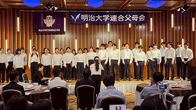 第三部の学生パフォーマンスでは、「明治大学混声合唱団」による合唱。親世代に合わせてくれた選曲、素晴らしい合唱が会場全体に響きました。その後、役員に対して校歌を指導してくれました。