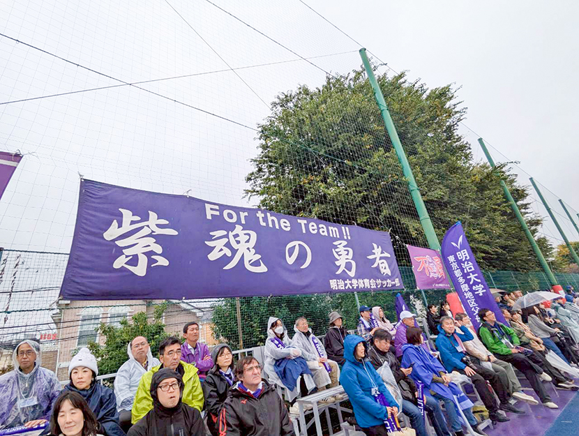 10月25日(土)、八幡山グラウンドで開催された関東大学サッカーリーグ戦「明治大学 VS 東京国際大学」の試合に、神奈川県西部地区父母会から8名が応援に駆けつけました。小雨の降るあいにくの天気でしたが、多くの関係者やサポーターで賑わいました。会場には、明大OBのサイン入りタオルが当たるクイズ企画やキッチンカーも出店され、盛り上がりを見せました。