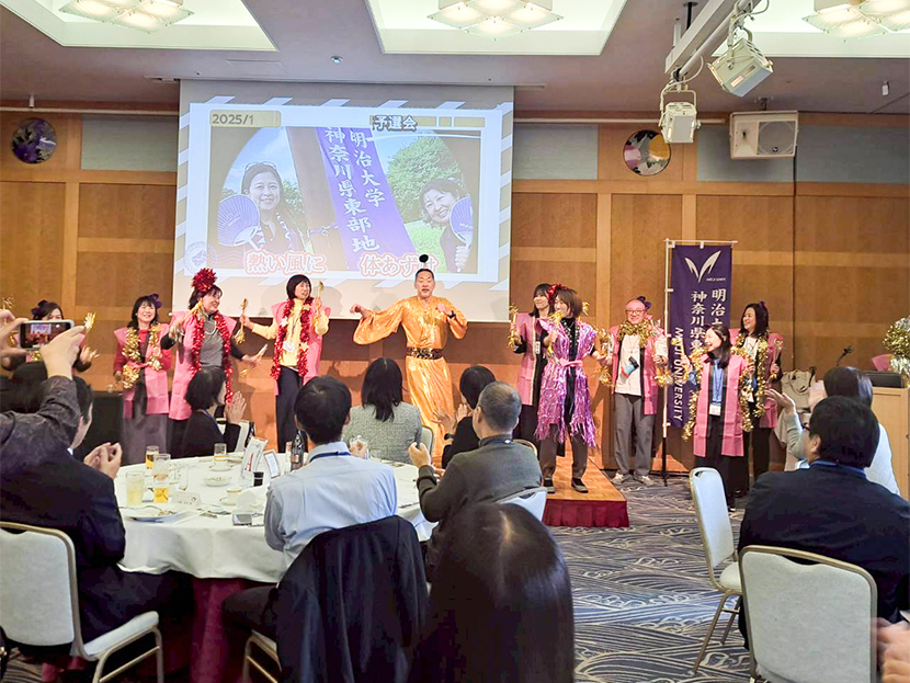 余興が終わったあとは、東部地区・松本顧問による閉会のご挨拶、校歌斉唱、全員での写真撮影で今年の東西地区父母交流会議は閉会となりました。今後も神奈川県の父母会を一緒に盛り上げて協力しながら、明治大学の学生の皆さんの支援・応援に取り組んでまいりたいと思います。