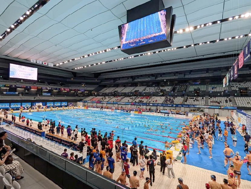 東京2020オリンピック競技会も行われた東京アクアティクスセンターは、オリンピック開催時は15,000人収容だったとのことですが、オリンピック終了後は減築する改修が行われ、現在は5,000人収容とのことです。大きい会場ながらも、比較的ゆったりとした座席。内部は空調も効いており、外は相変わらずの猛暑でしたが、中では非常に快適に過ごせました。