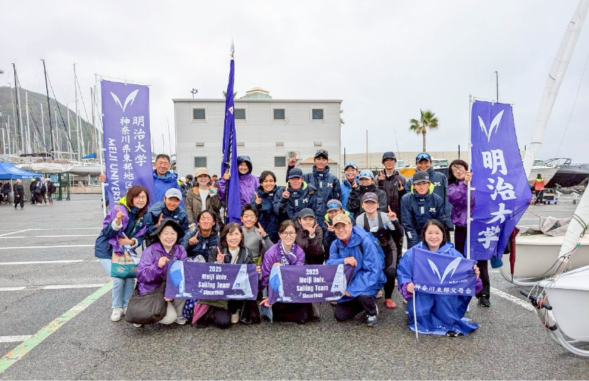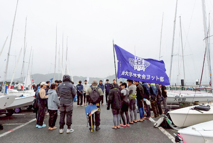 前日まで夏の余韻が残る天候から一変、朝から肌寒さを感じる風と時折頬を打つ雨という悪コンディションでしたが、各校とも大会開始に向け艇の準備を終え、我らが明治部員たちも円陣を組み「紫紺の歌」を歌い士気を高めていました。海上の視界が悪く大会開始時刻が遅れましたが、ヨットの出港可を意味する「D旗」が掲げられると、各校応援団からの熱い声援の中、Mマークを掲げた明治大学の6艇も颯爽と大海原へと出港していきました。