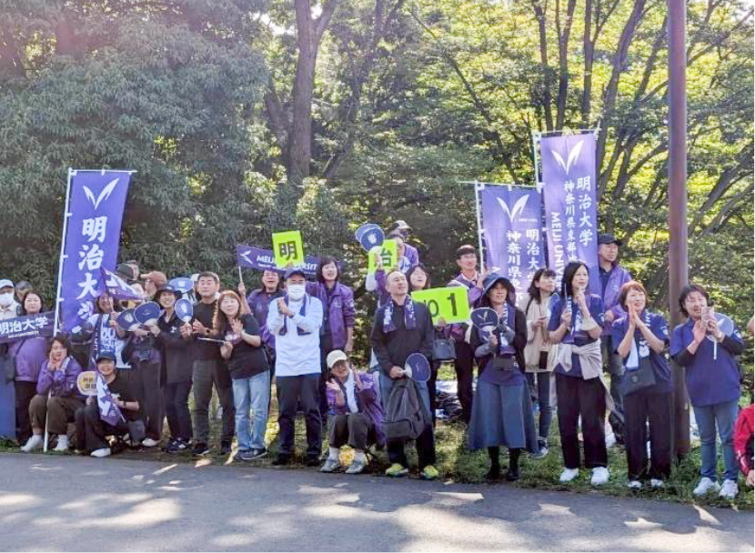 今年4月には明治大学創立150周年記念事業「紫紺の襷プロジェクト」が始動、2031年度の箱根駅伝で優勝を目指すプロジェクトです。チームは昨年12位の悔しさを胸に、大志田駅伝監督のもと努力を重ねてきました。父母会の応援も熱が入ります。