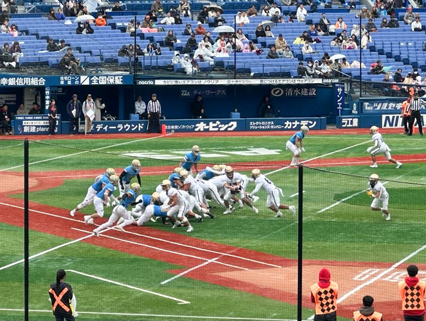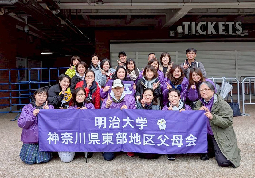 11月9日(日)明治大学アメリカンフットボール部GRIFFINS今季リーグ最終戦が、横浜スタジアムで開催されました。相手は東京大学WARRIORS、勝者のみが甲子園ボウルを目指して強豪校が集う“全日本大学選手権”への切符を手にする決戦かつ地元開催、見逃すわけにはいきません。冷たい雨にもかかわらず、一般会員と役員合わせた約50名の神奈川県東部地区父母会”応援団”が駆けつけました。
