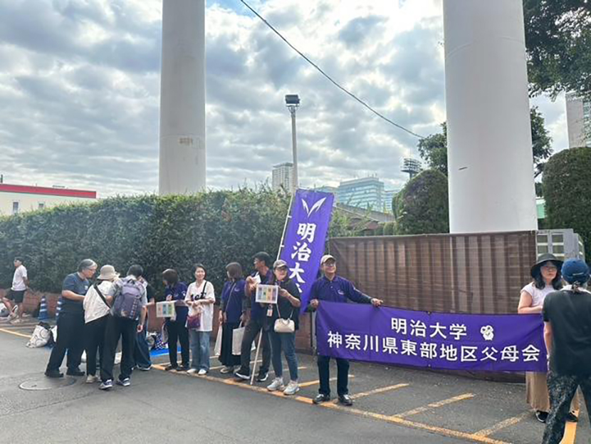 紫のウインドブレーカー、またはポロシャツを着た父母会役員がお待ちしています。「明治大学神奈川県東部地区父母会」のぼり旗を目印にお越しください。必ず代表者がチケットを引き取り願います。