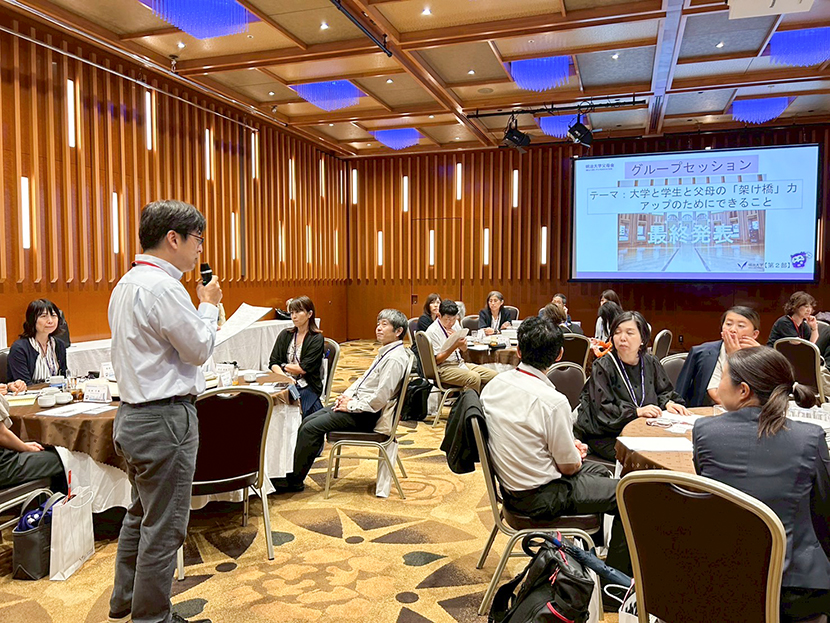 「大学、学生、父母『架け橋』力アップのためにできること」をテーマに、テーブルごとにディスカッションを行い、その内容をまとめ、各テーブルの代表者が2分間発表する形式がとられました。各グループ様々なご意見、ご要望などが出てきておりました。