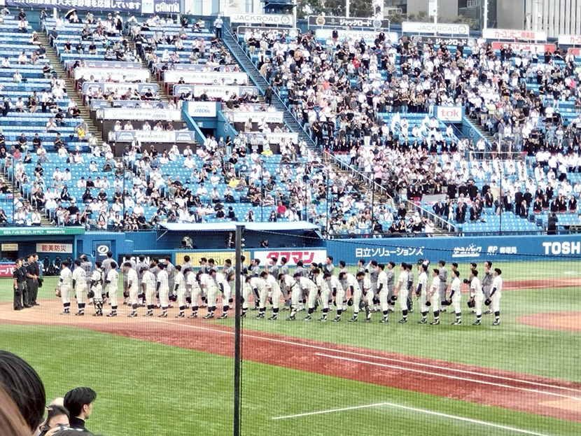 明治・慶應両大学の熱いエールの交換から始まり、白熱した試合が始まりました。先制したのは明治、2回裏に1点、3回まで打線がつながり2得点で主導権を握ると、5回裏にも追加点を取り、そのまま慶應打線を完封、3対0で勝利しました。