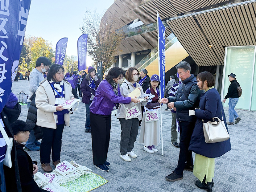 冬晴れの中、会場には期待感を胸にした会員の皆様が続々と集まりました。応援グッズを手に明治の勝利を願う笑顔であふれます。