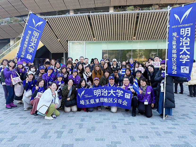 12月7日(日)快晴の国立競技場で最終戦となる明治大学対早稲田大学が行われました。埼玉県東部地区父母会では、応援会を開催し、本年度も多くの会員の皆さまにご参加いただき、総勢70名の大応援となりました。紫紺の応援席は試合前から大きな熱気に包まれました。
