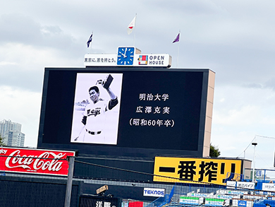 試合に先立ち、野球解説者としてご活躍されている明治大学OBである広澤克実氏による始球式が行われました。ノーバウンドの伸びやかな投球に、試合開始前から大いに盛り上がりました。