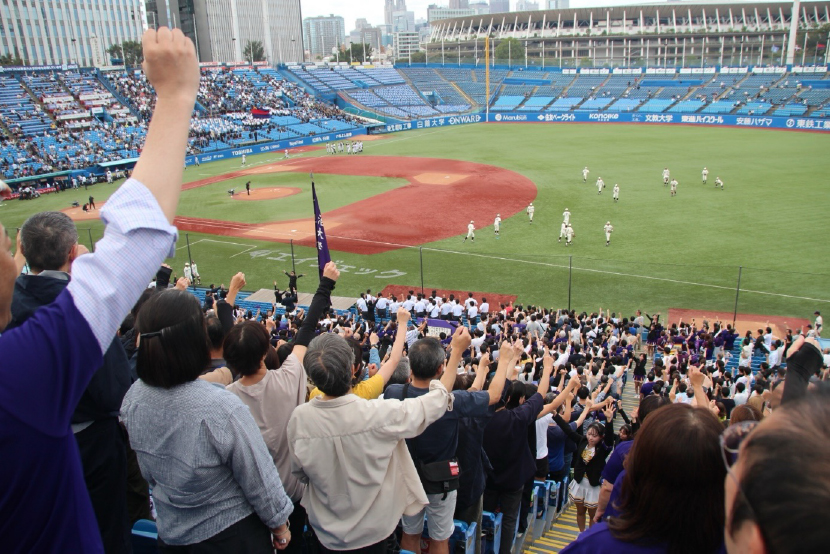 応援席は紫紺に染まり、神宮に明大校歌が響き渡りました。