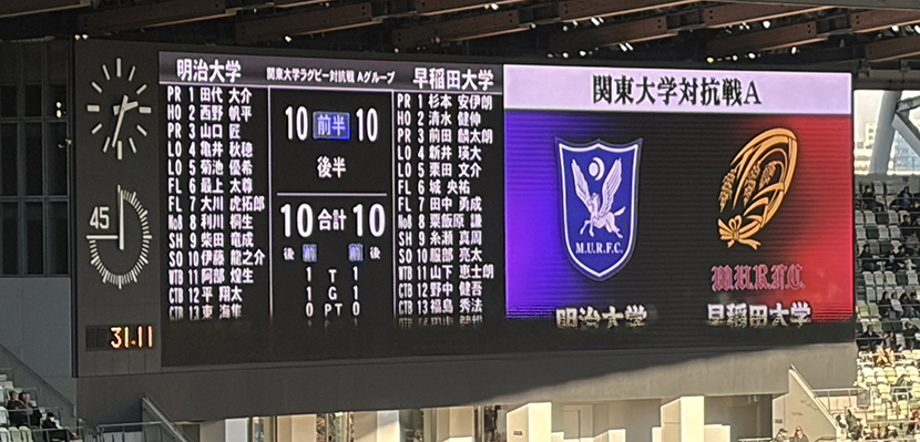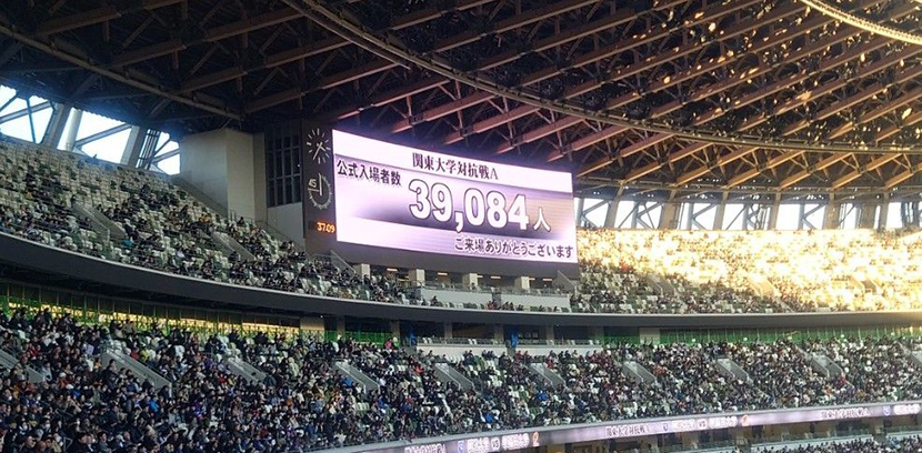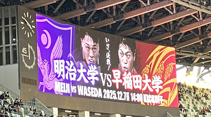 試合当日は快晴に恵まれ、39,084人の大観衆が見守る中、キックオフ(試合開始)を迎えました。今年度のラグビー部のスローガンは『完遂』です。7季ぶりの大学日本一へ、伝統の一戦が幕を開けました。