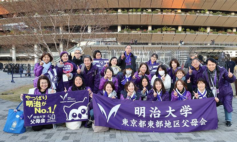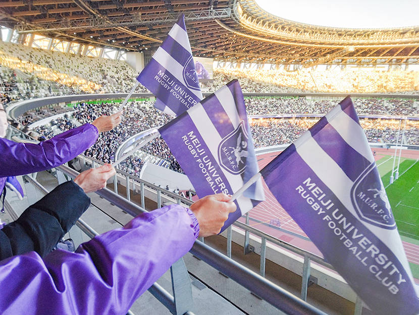 2025年12月7日(日)国立競技場にて、関東大学ラグビー対抗戦、第101回目となる明治大学対早稲田大学の試合が開催されました。試合当日は東京都東部地区の父母および運営委員を合わせた総勢130名が明治大学ラグビー部を一丸となって応援しました。その際応援グッズとして父母会より、参加した父母の方々へ応援フラッグとルールブックがプレゼントされました。