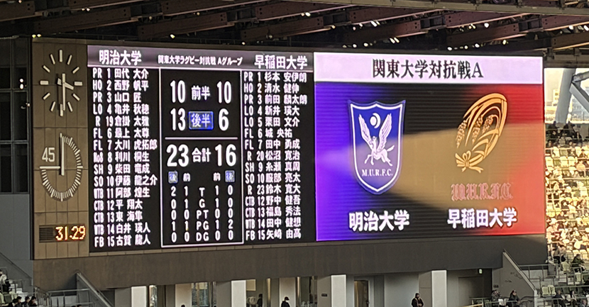 後半6分、明治大学が早稲田大学のキックをチャージ。こぼれ球を逃さず、東海隼選手が勝ち越しのトライを決めました。その後、31分には明治大学の最上選手が2本目のトライを挙げ、試合終盤の早稲田大学による猛攻を粘り強く阻み、6点差で逃げ切りました。明治大学は25-19で見事勝利を手にし、5年ぶり19回目の優勝を果たしました。