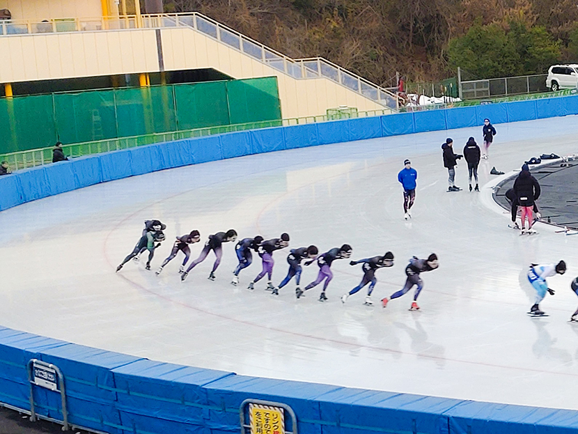 愛知県ではフィギアスケートは馴染みがありますが、スピードスケート競技を見る機会がないので、今回訪問した全員が、まずスケートリンクの大きさに驚きました。そして、寒い中ひたむきにトレーニングする選手たち、また練習の滑りとは思えないほどのスピードの速さを間近で見学させていただきました。