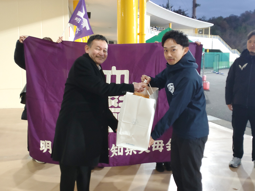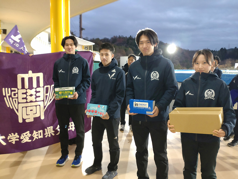 創部100周年を迎えた伝統ある明治大学スケート部スピードスケート部門の選手たちが、岐阜県恵那市で開催の『全日本選抜スピードスケート競技会 恵那』(12月5日~7日)に出場するということで、公式練習日である12月4日に愛知県父母会から奥田会長、他5名で訪問し、大会に先駆けて選手激励および差し入れを致しました。