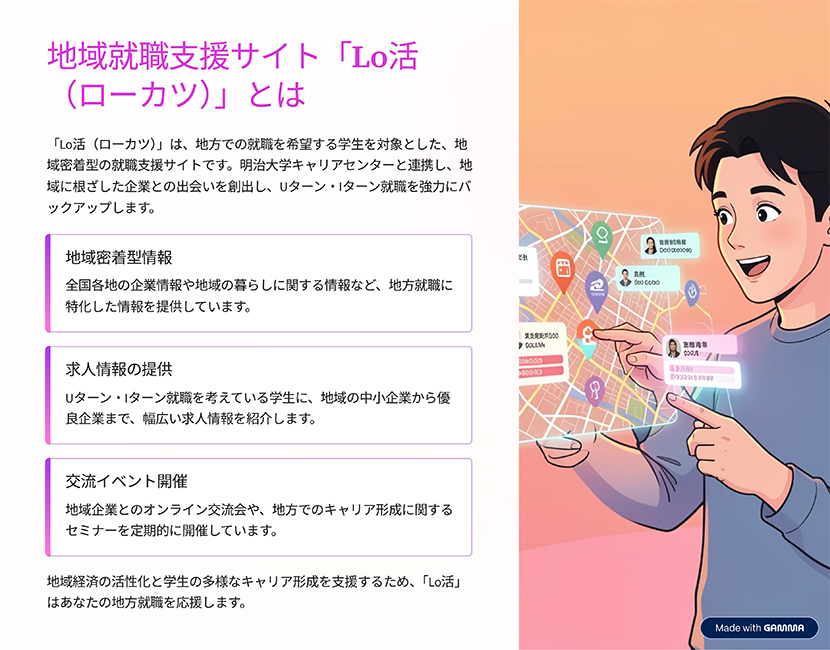 明治大学のキャリアセンターの紹介、地元就職の状況を聞けたことはよかった。