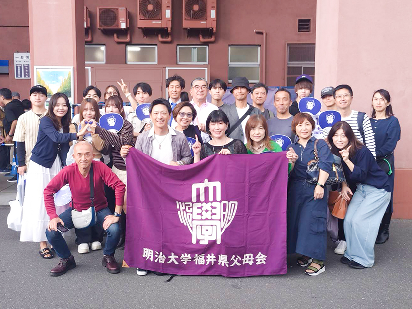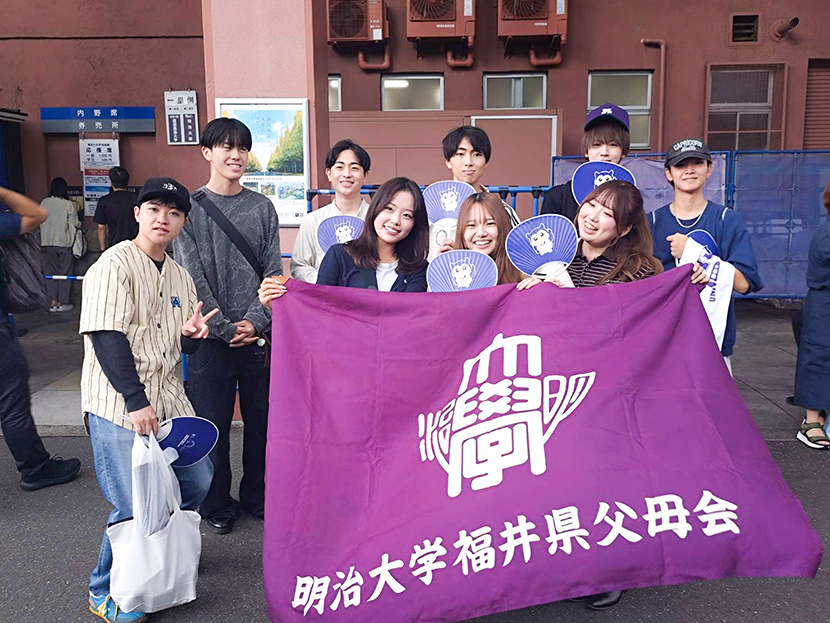 参加いただいた学生には、「豪華福井の選べるグルメ」をプレゼント。そして、父母を含む参加者全員に明治大学のうちわと「奪還」の文字が入った紫紺の応援タオルをプレゼント。