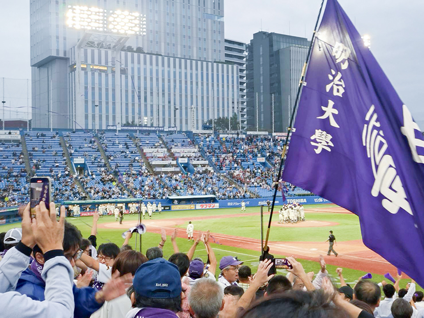 いよいよ試合開始です。試合前には校歌斉唱で気持ちが一つになり、明治大学側スタンド全員が勝利を願います!声を張り上げ、枯れるまで必死に応援する応援団、そして笑顔でエールを送り、観客を巻き込みながら輝きを放つチア。会場全体が一体となり初回から大盛り上がりでした。