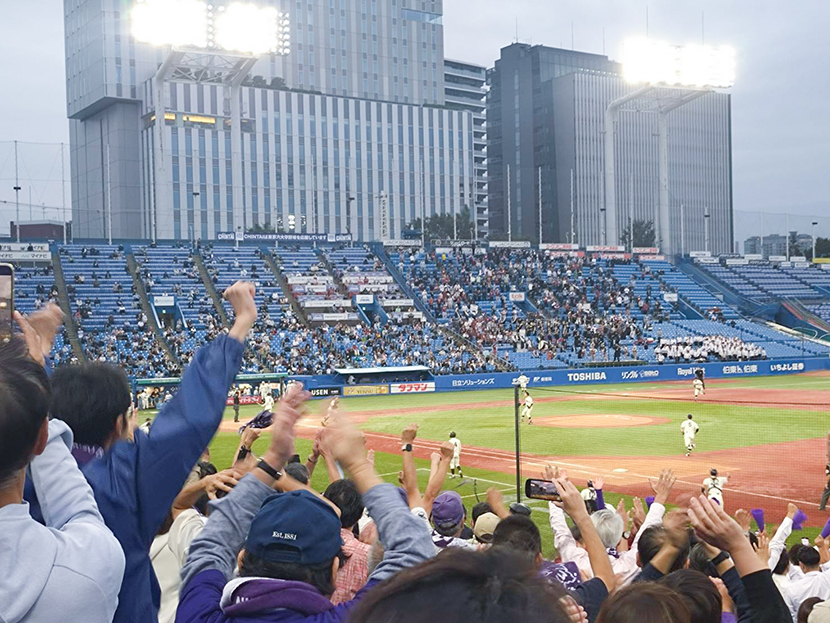 そして5回裏。ついに均衡を破るタイムリーツーベースヒット。スタンドが一体となりタオルを振り、肩を組んでの「紫紺の歌」「校歌」の大合唱。この盛り上がりはぜひ体験して欲しいです!