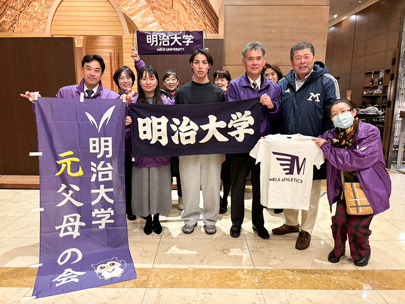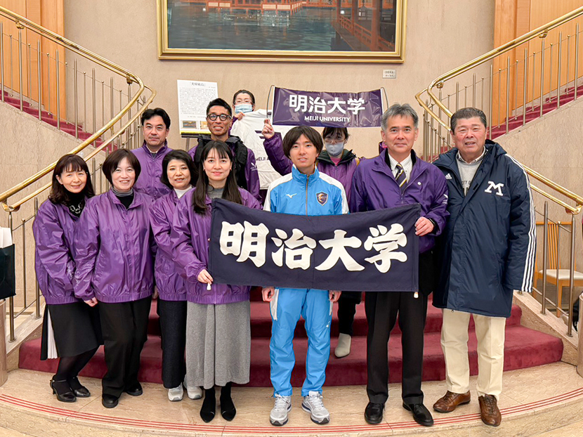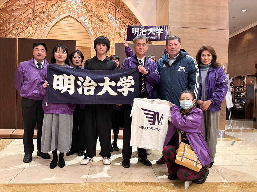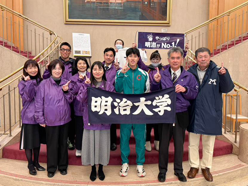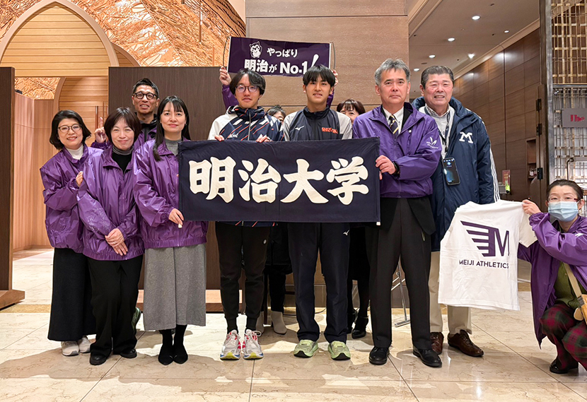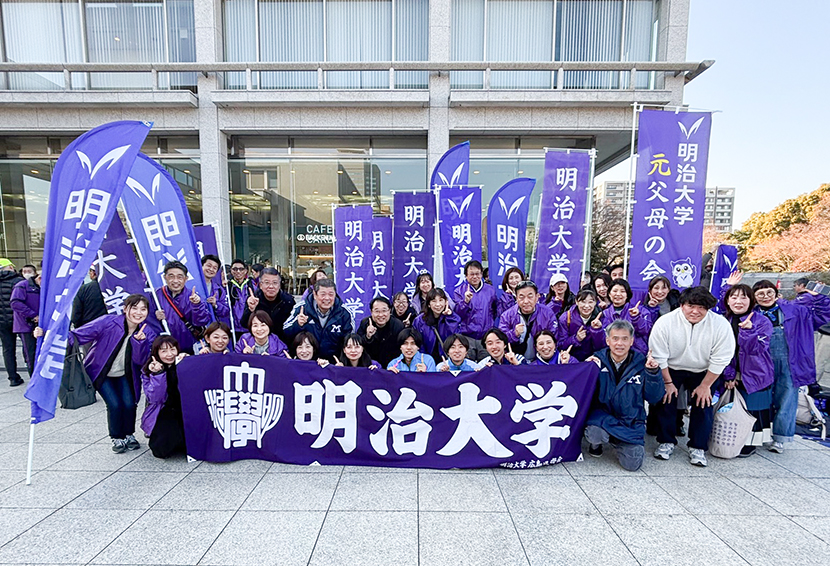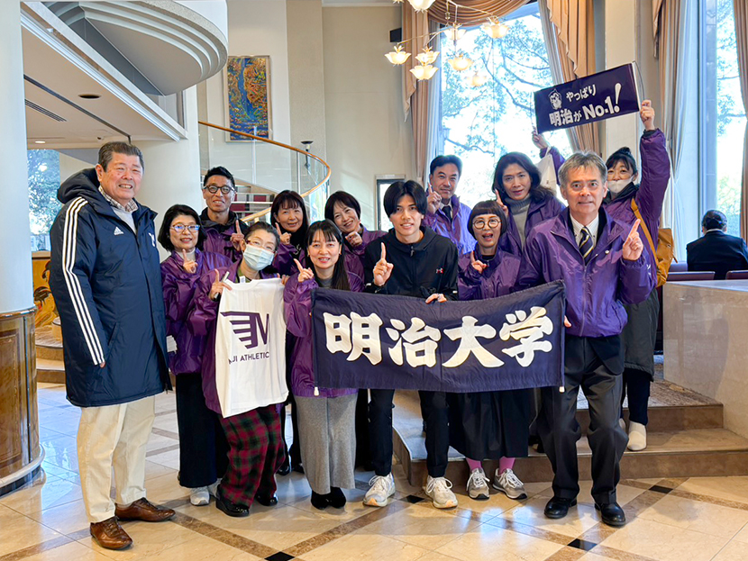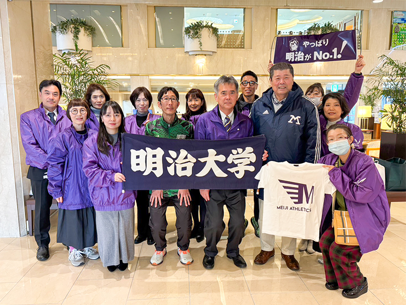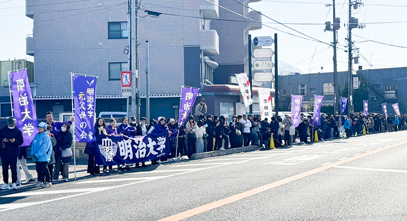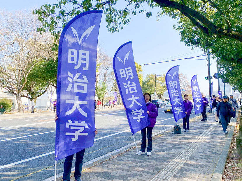 スタート地点の平和公園前と折り返し地点の宮島口に分かれ、明治大学関係者(現役生、出身OB、入学内定者)の沿道応援を行いました。