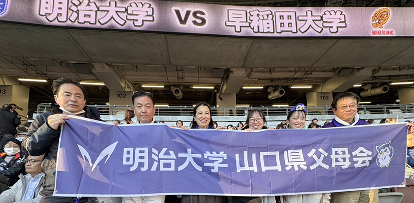 12月7日(日)に行われた第101回ラグビー明早戦に、明治大学山口県父母会として参加いたしました。今年は中国地区協議会による合同応援という形で、地域を超えて力を合わせ、選手たちへ熱い声援を送る機会となりました。