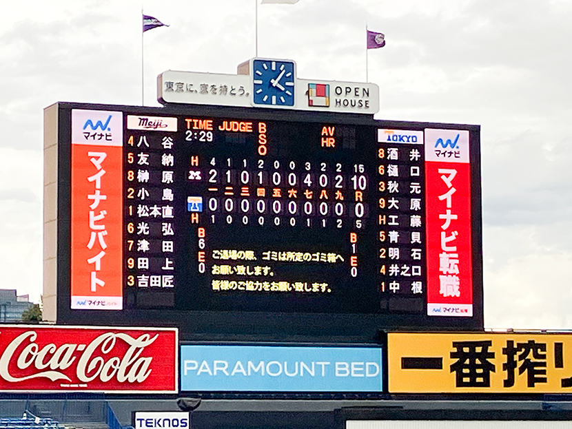 やっぱり応援席で応援団との一体感を楽しみたい!とご一行で応援席へ。香川県出身の大室亮満投手が初先発ということで、更に楽しみが増えたねと応援に力が入ります。ご両親の見守る中、1回に走者一人を出すも、けん制で刺し、5回まで1人の走者も許さない安定した素晴らしいピッチングを披露し、観客を沸かせました。大室投手は2年生ながら、今年の春季リーグ戦でも東京大学戦で1イニングを無失点3奪三振という結果を残しており、今後の活躍も非常に楽しみです。明治大学が主導する好ゲームとなり10対0の圧勝!非常にエキサイティングな時間を過ごすことができました。