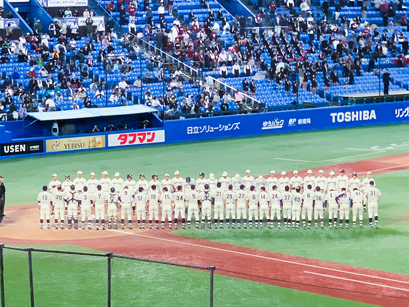 試合は終始、両校のエースが持ち味を存分に発揮する「一点を争う投手戦」となりました。打球音が響くたび、球場全体が息を呑み、まさに手に汗握る展開。その緊張感のなかでも、明治ナインは一人一人が落ち着きを保ち、粘り強く、そして誇りある野球を見せてくれました。