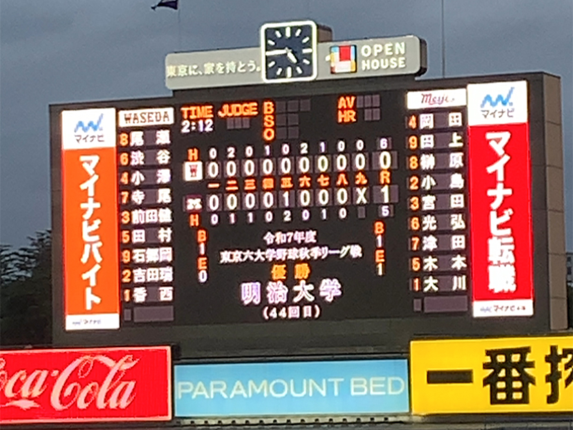 そして迎えた終盤、待望の得点が明治に入り、そのまま投手陣が守り切り試合終了。スタンドに広がる歓声、選手たちの笑顔、応援団の演舞、拍手の波。勝利の瞬間は、ただの1勝ではなく「明治らしさの奪還」であったと感じました。