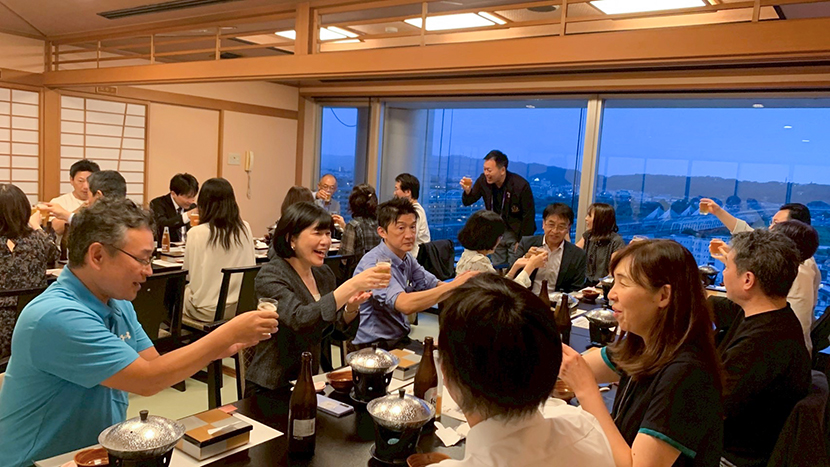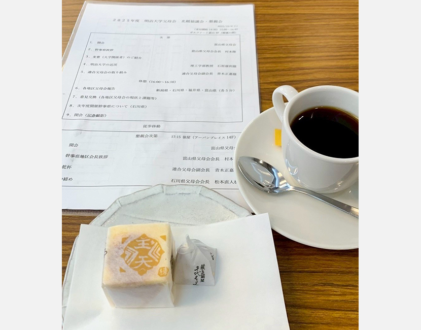 お茶うけには富山県銘菓でおもてなし。夕方の懇親会では夕焼けに染まる立山連峰を背に青木連合父母会副会長の乾杯で地区を超えた交流で大いに盛り上がり、11月の明大祭や12月のラクビー観戦での再会を誓い合いました。子供たちに感謝です。