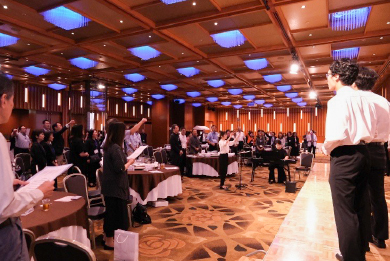 休憩を挟んだ後に第2部を開始。先ずは各地区メンバがテーブル毎に仲良くなってもらうため、 「私の趣味、好きなこと、熱中していること」をテーマに、1人1分間の自己紹介が行われました。次いでグループセッションへ移行し、「大学と学生と父母の「架け橋」力アップのためにできること」をテーマに、テーブル毎に意見交換をしました。同じ役割委員(学生支援・広報・総務・会計など)どうしでテーブル分けをしていたので、地区毎の共通課題や地区独自のソリューションなど、活発な意見交換がなされました。発表は各テーブル2分と決めてあり、司会者からの「あと30秒です」と経過時間を伝えるアナウンスで緊張感が伝わるなか、皆さん懸命に意見をまとめて発表されていました。
