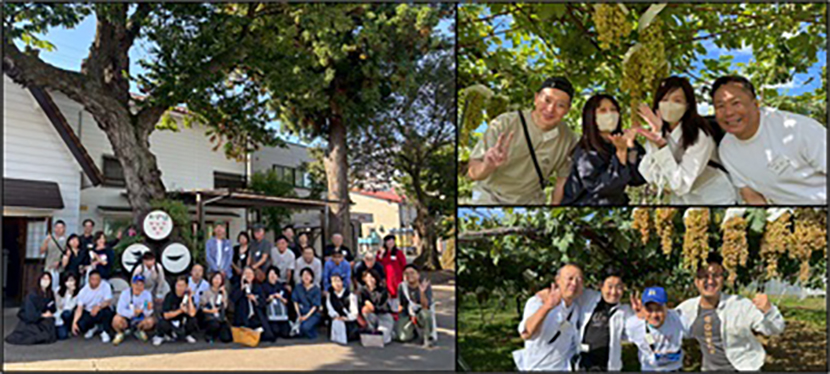 最初の目的地は、塩尻市の老舗ワイナリー「五一わいん」。樽香ただよう店内には、信州産ぶどうを使った芳醇なワインがずらりと並び、皆さんお土産選びに夢中になりました。「家族へのおみやげに」「自分へのご褒美に」そんな声があちこちから聞こえてきました。さらに今回は、特別にワイナリーの敷地内にあるブドウ棚を見学させていただきました。秋の日差しの中、実りの房が並ぶブドウ畑を歩くと、自然と笑顔がこぼれます。ブドウの香り、澄んだ空気、そして参加者の笑い声。そのどれもが、信州の豊かさと父母会の温かさを感じさせるひとときとなりました。