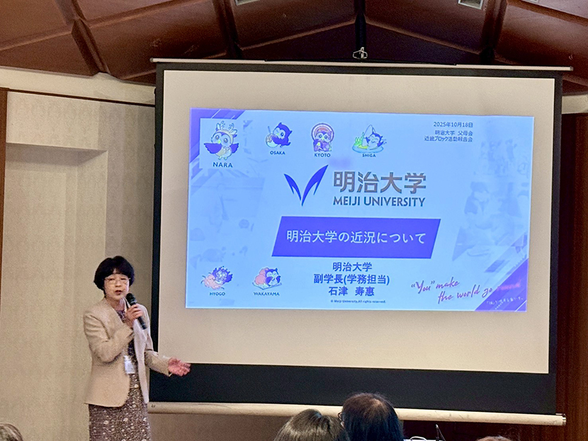 本年度は、明治大学より石津寿惠副学長、前田浩大学支援部調査役、連合父母会から橋本副会長、元父母会の片桐監事をご来賓にお迎えしました。石津副学長より、明治大学の近況についてお話いただきました。大学の取組について知ることができ、また、学生達の日頃の様子が目に浮かぶお話は、地方の保護者にとって大変意義深い内容でした。