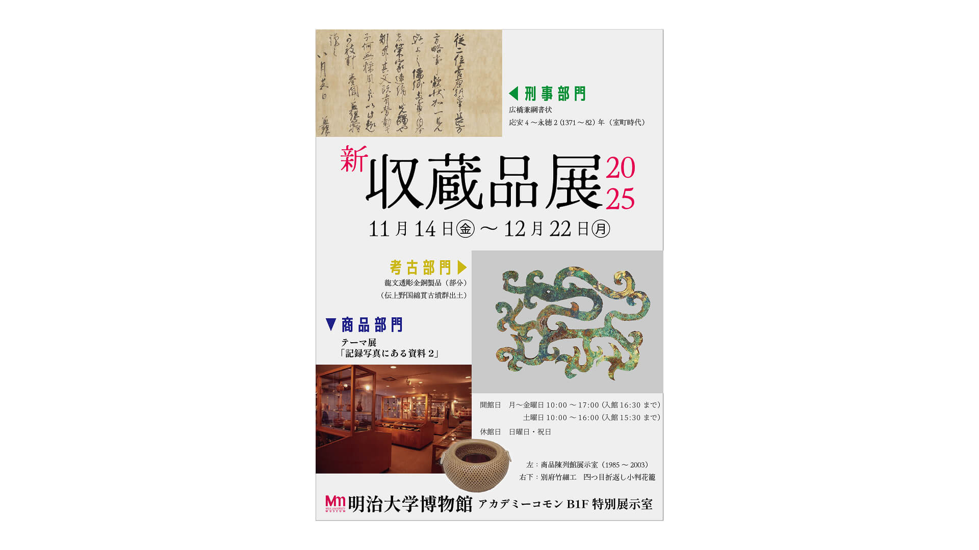 2024年度の新収蔵資料及び関連資料を公開します。考古部門は古墳時代の龍文透彫金銅製品(伝群馬県出土)、刑事部門からは、14世紀の「広橋兼綱書状」を出展します。また、商品部門はテーマ展「記録写真にある資料2」を開催します。