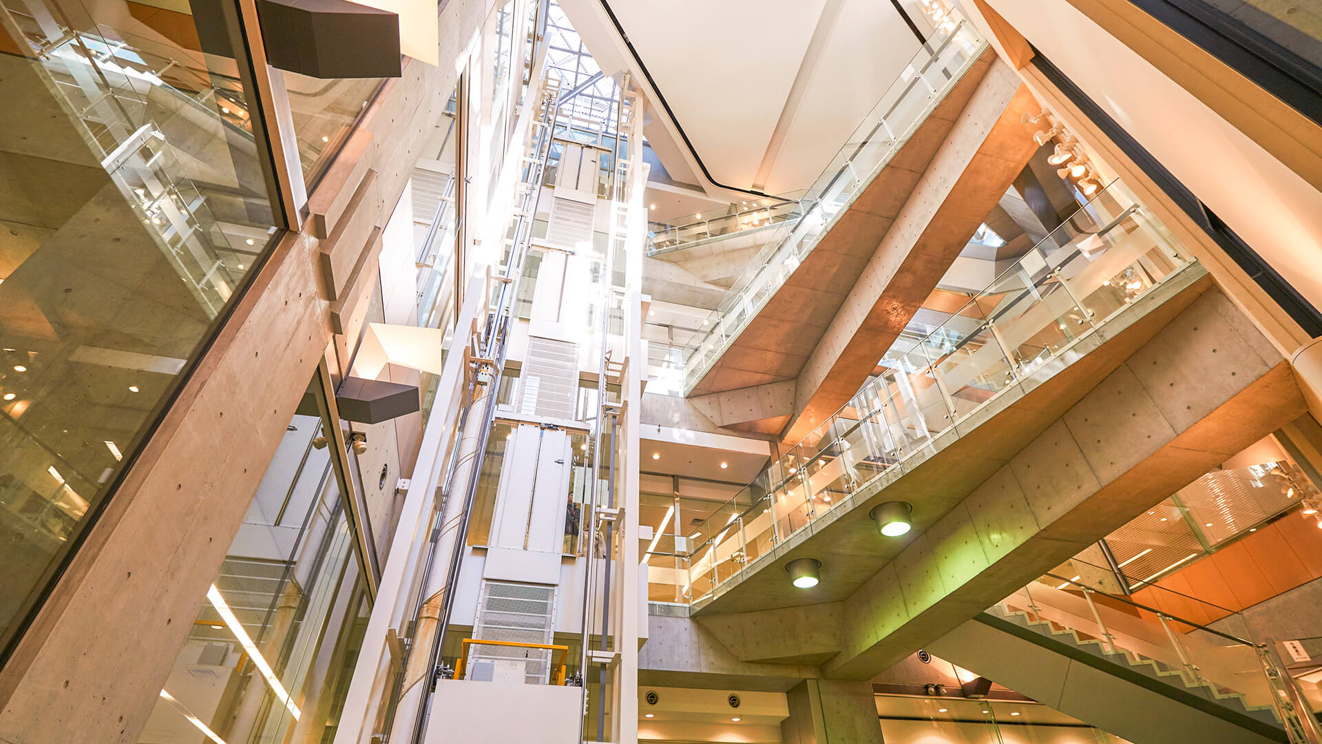 120万冊以上を所蔵する明治大学で最大規模の図書館です。社会科学系と人文学系が特に充実。大きな窓を通して地下3階でも明るい光が差し込み、吹き抜けは美しい空間となっています。