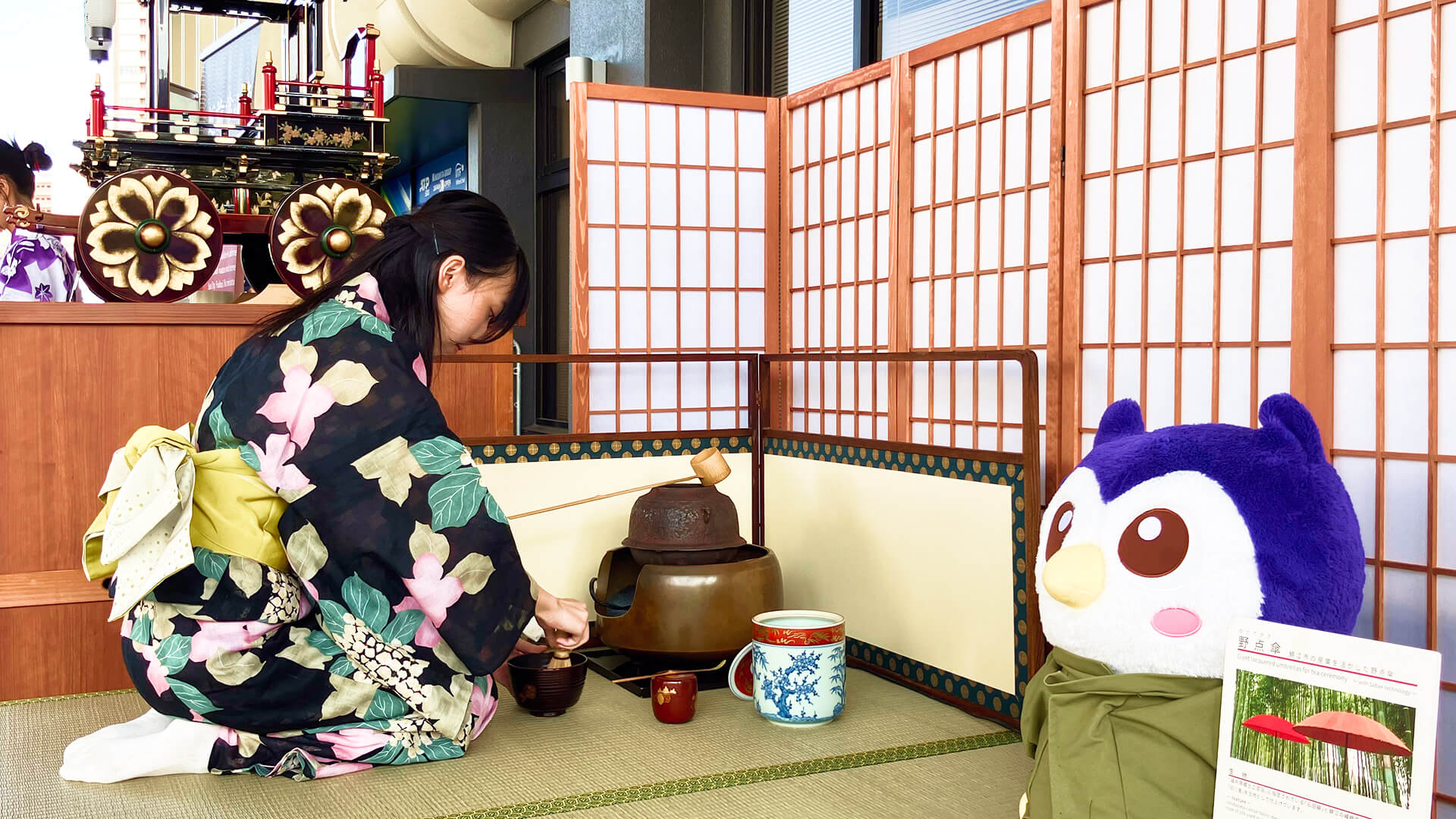 父母交流会呈茶席では立礼式お点前で皆様を、部員一同心を込めておもてなしいたします。グローバルフロントの壮大な景色と共にお茶とお菓子をご提供いたします。部員による生け花の作品も併せてお楽しみください。
