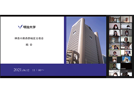 去る6月12日(土)、2021年度明治大学神奈川県西部地区父母会総会を開催いたしました。新型コロナウイルス感染症拡大の影響により、今年度はZoomを用いてのオンライン開催といたしました。