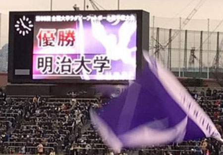ディフェンディングチャンピオンの我が明治大学ラグビー部の試合はいつも明治ファンで一杯です。